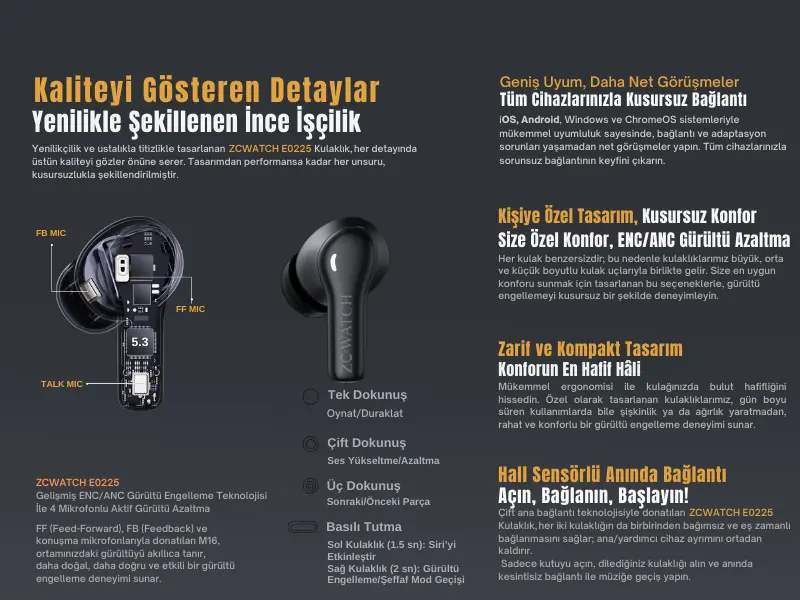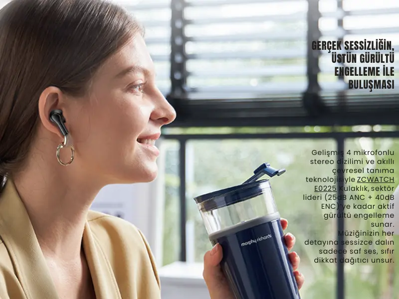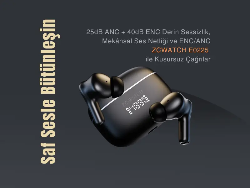 ZCWATCH E0225, gelişmiş aktif gürültü engelleme (ANC) ve çevresel gürültü engelleme (ENC) teknolojileriyle donatılmış yeni nesil bir Bluetooth 5.3 TWS kulaklıktır.